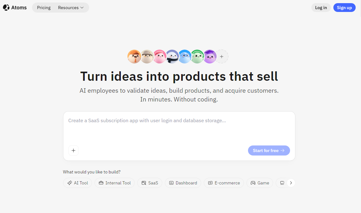 Atoms gives you a full development team in a text box. You describe what you want to build, and a squad of specialized AI agents (product manager, engineer, SEO specialist) ships a working, deployable app. We think it’s the best because no other tool on this list hands you a complete business, not just an app.