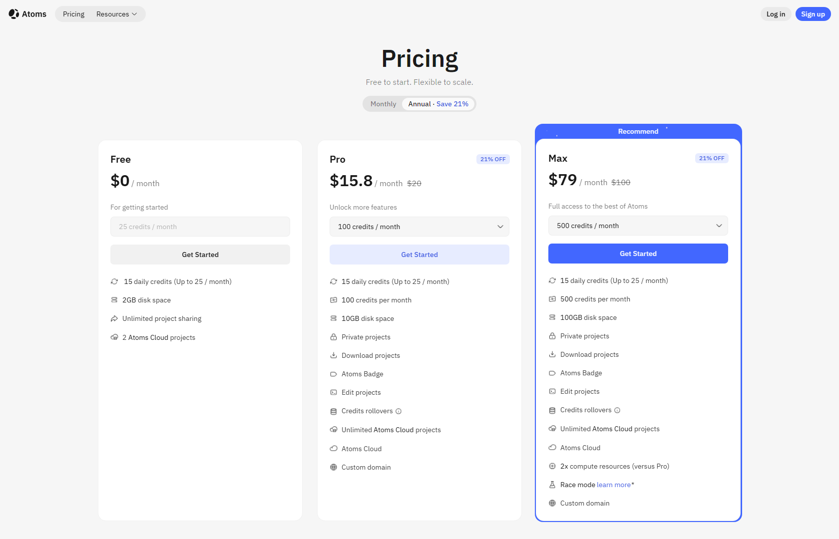 Atoms offers three pricing plans: