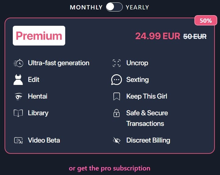 - Premium Monthly: €24.99/month for photo-realistic and hentai creations.